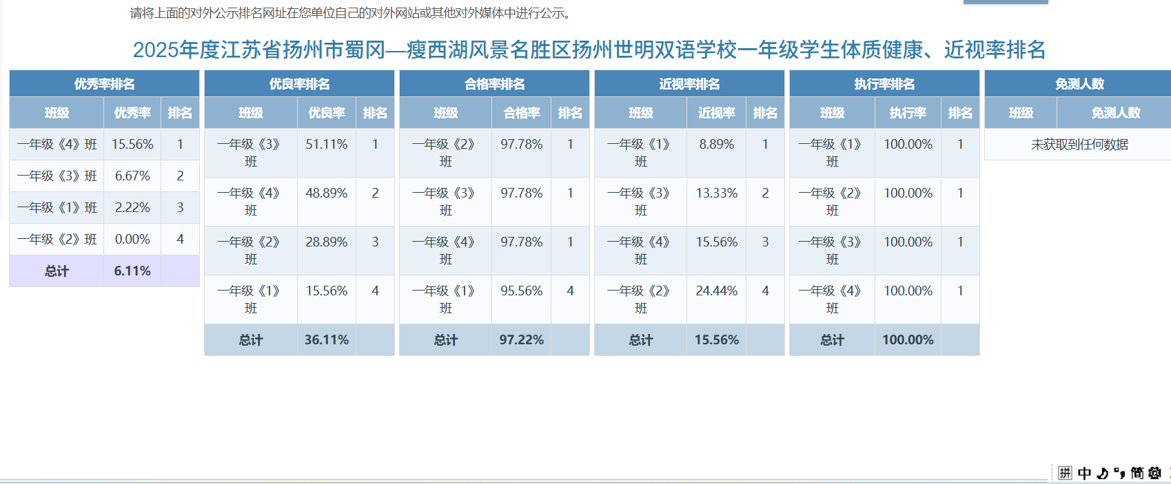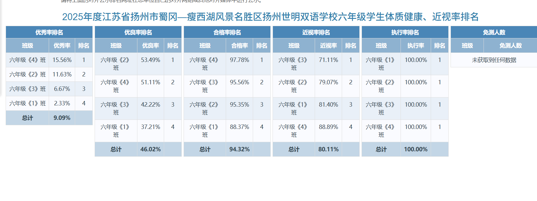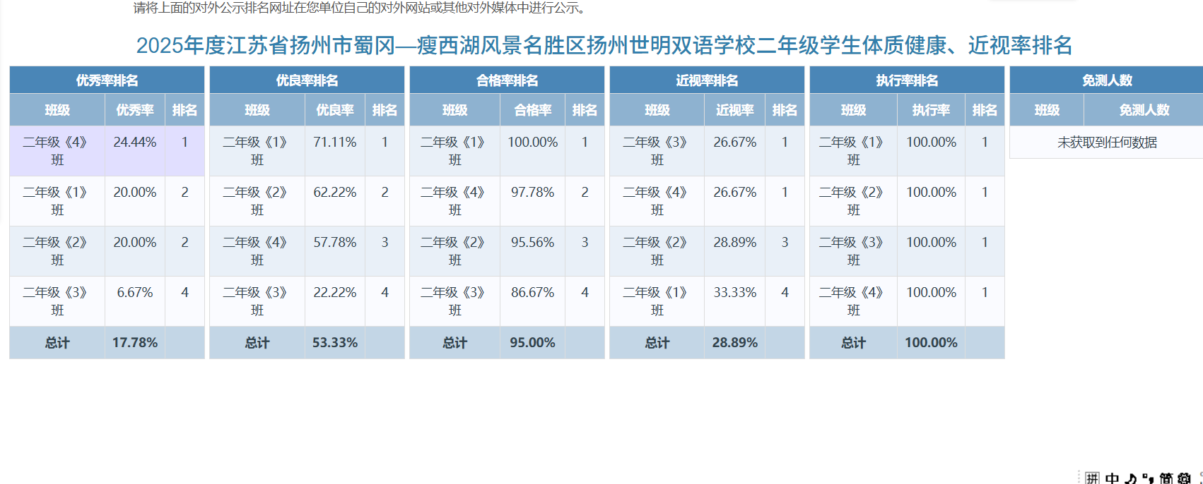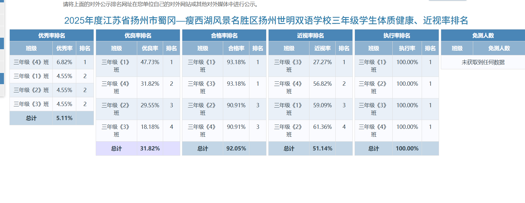 为践行“健康第一”教育理念,落实学生体质健康监测与公示要求,全面推进学生身心健康协调发展,现就我校2025年学生体质健康测试数据优秀率、优良率、合格率、近视率等排名情况公示如下: